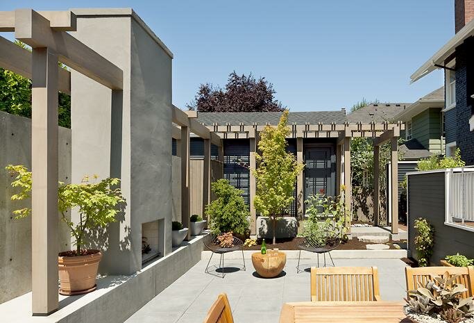 Privacy was achieved by an architectural concrete wall that fortifies the separation from the alley and hides a new parking space while a heavy timber trellis buffers the garage.