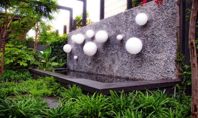 The focal point of the main courtyard is a walled reflective pond dotted with designer ‘Balloon lights’. Mosaic pebble swirls installed by a local artist echo the shapes of these lights. In the centre of the courtyard, a round spa, lined with a the same pebble finish sits amongst flags of stone with planting that runs right up to the water’s edge. – from Eckersley Garden Architecture.